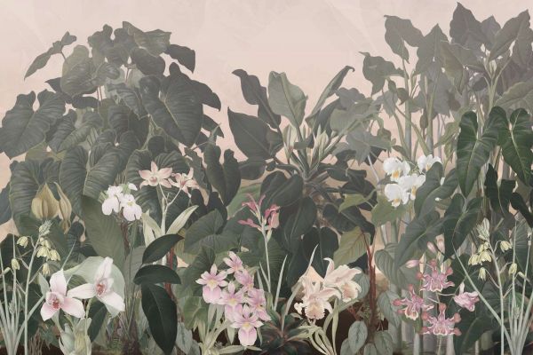 Deze ontwerpen ademen de rijkdom en diversiteit van tropische landschappen. Grote, levendige bladeren vormen een dichte achtergrond, waarin delicate bloemen zoals orchideeën subtiel naar voren komen. De combinatie van diepe groentinten en zachte pastelaccenten creëert een perfecte balans tussen robuuste natuur en verfijnde elegantie. Het kleurgebruik, variërend van subtiele sepia-tinten tot frisse blauw- en groentinten, voegt een serene en uitnodigende sfeer toe.