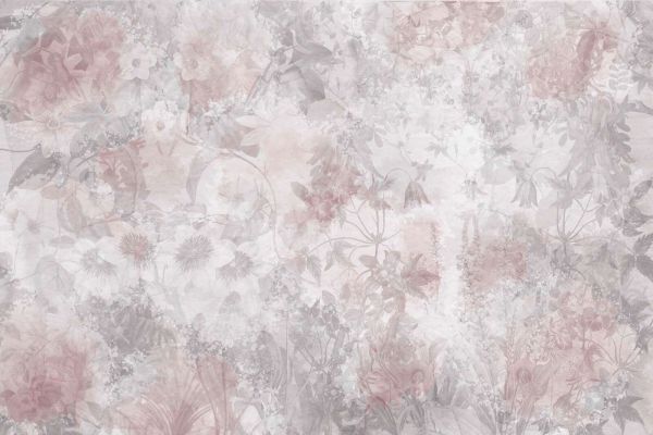 Een sfeervol en romantisch bloemenpatroon in zachte pastelkleuren. De delicate mengeling van roze en grijstinten geeft een dromerige en subtiele uitstraling. De bloemen en bladeren vloeien moeiteloos in elkaar over, waardoor een zachte gelaagdheid ontstaat die een rustige en elegante sfeer creëert.