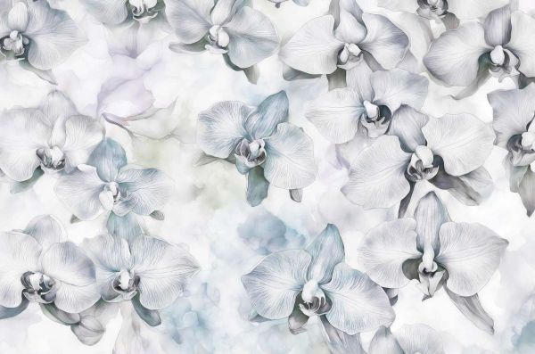 Dit ontwerp toont een verfijnd en sereen tafereel van grote orchideeënbloemen, die met zachte potlood- en aquarellijnen tot leven komen. De bloemen zijn uitgevoerd in een gedempt kleurenpalet van ijsblauw, zilvergrijs en gebroken wit, met subtiele schaduwen die voor diepte en realisme zorgen. De achtergrond is opgebouwd uit dromerige pasteltinten zoals lichtblauw, lila en zachtgroen, die lijken op waterverfvlekken die langzaam in elkaar overlopen.