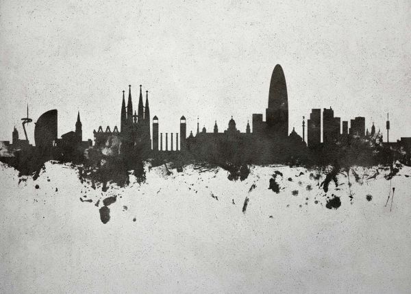 Een waterverf skyline van Barcelona in Urban stijl. De skyline is te bestellen met verschillende achtergronden.