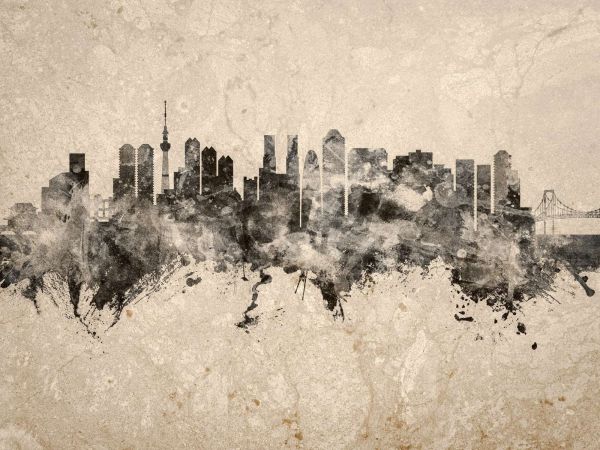 Een waterverf skyline van Tokyo in Urban stijl. De skyline is te bestellen met verschillende achtergronden.