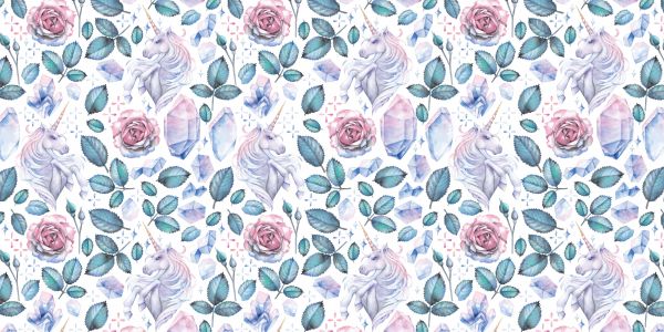 Watergeverfde unicorns met rozen en bladeren van rozen. Combineer dit fotobehang in de kinderkamer voor nog meer sfeer.