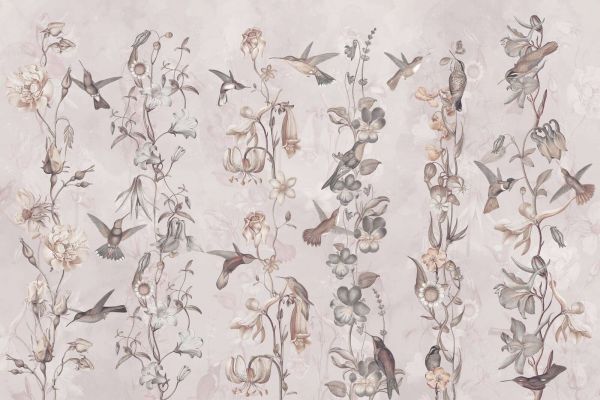 Een romantisch en verfijnd ontwerp met sierlijke kolibries die fladderen tussen gedetailleerde bloemenranken. De zachte beige, taupe en grijstinten geven een vintage uitstraling, terwijl subtiele accenten van crème en bruin warmte toevoegen. Dit harmonieuze tafereel straalt rust en elegantie uit, perfect voor een dromerige en sfeervolle ruimte.