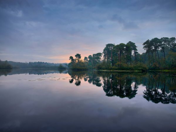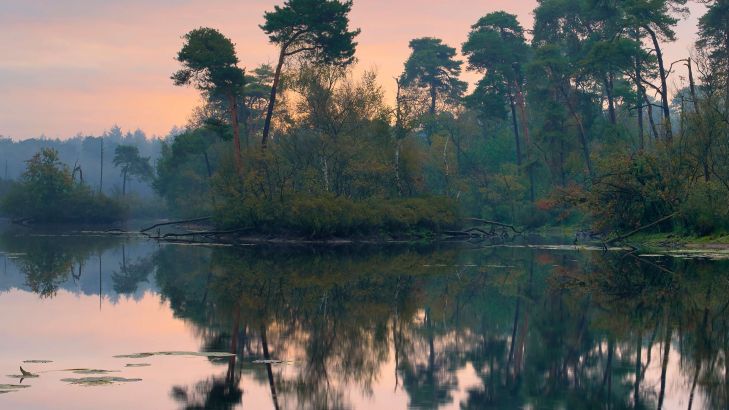 Fraaie weerspiegeling in bossen bij zonsopkomst. Geniet elke dag van de zonsopkomst met dit mooie fotobehang.