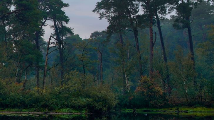 Fotobehang - Weerspiegeling in bossen bij zonsopkomst