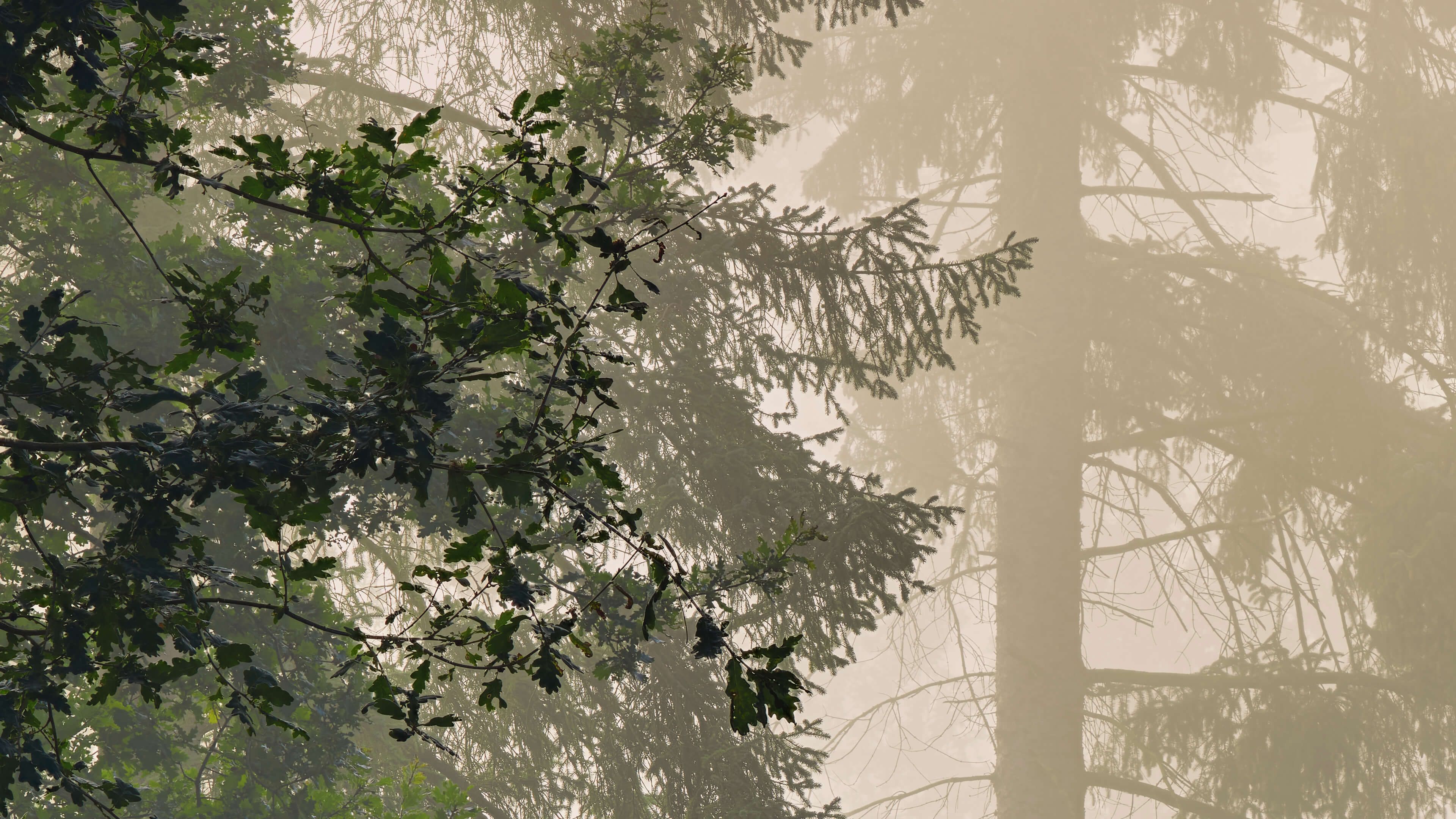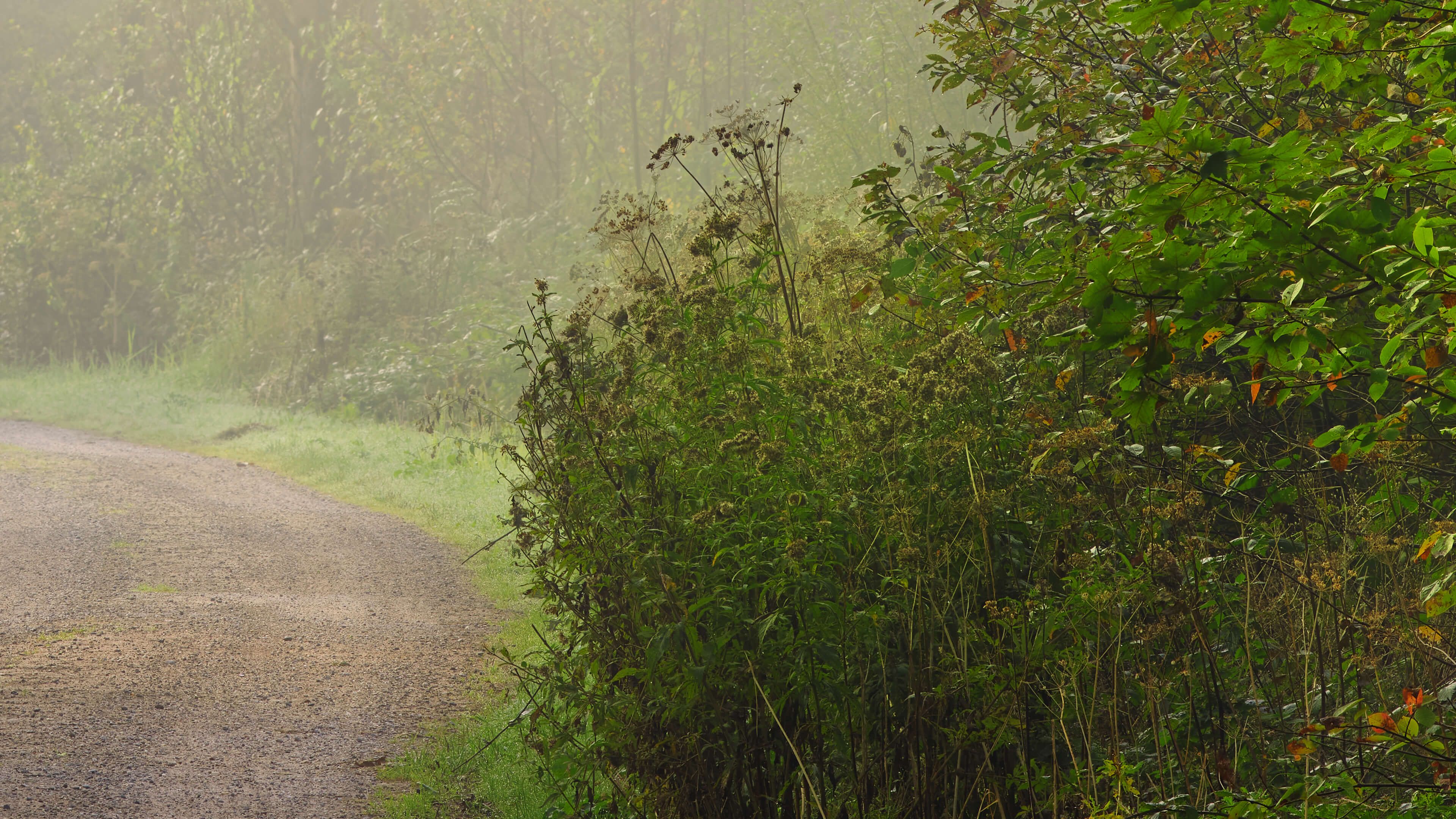 Weg door mistig bos in verschillende materialen