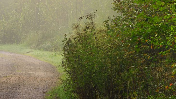 Weg door mistig bos