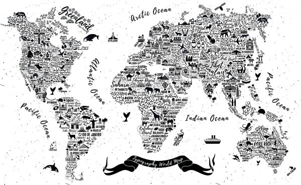 Een tekening van een wereldkaart in de kleuren zwart en wit met verschillende tekeningen erop.