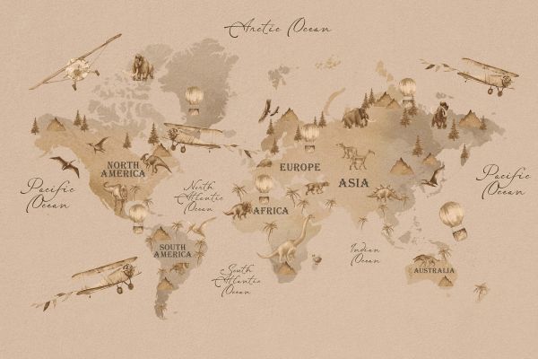 Fotobehang - Wereldkaart met dino's taupe