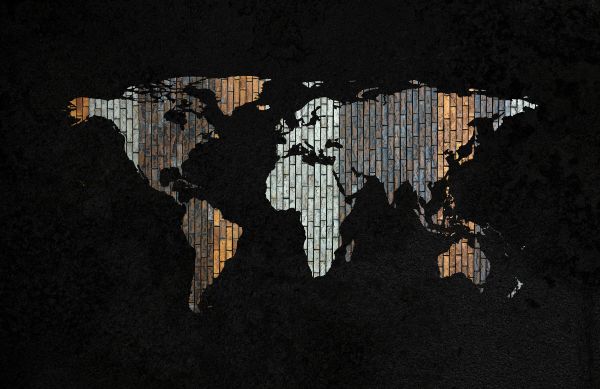 Wereldkaart met verticale gekleurde bakstenen. Door de zwarte achtergrond komt de wereldkaart goed naar voren.