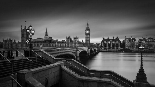 Westminster Bridge op fotobehang in het zwart-wit. Met dit fotobehang haal je Engeland op een unieke manier in huis.