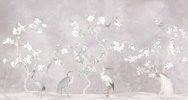 Een verfijnd ontwerp met delicate bloesems, elegante vogels en subtiele natuurlijke tinten. Dit design straalt rust en harmonie uit, perfect om een ruimte een zachte, romantische uitstraling te geven.