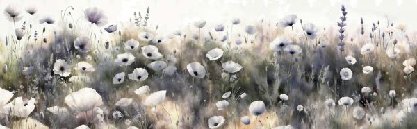 Dit dromerige ontwerp toont een uitgestrekte bloemenweide vol bloeiende klaprozen, lavendel en wilde grassen. De bloemen zijn geschilderd in een luchtige aquarelstijl, met tinten van crème, lila, zachtblauw en grijsgroen die subtiel in elkaar overvloeien. De achtergrond vervaagt langzaam naar een lichte hemel, wat een gevoel van diepte en openheid creëert. De transparante penseelstreken en zachte overgangen geven het geheel een serene, haast meditatieve uitstraling.