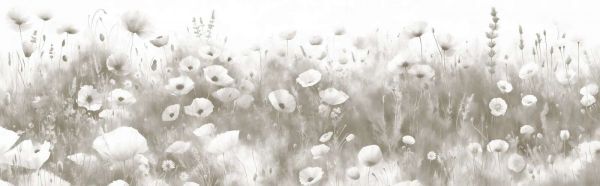 In de Cream-versie van deze bloemenweide is de nadruk gelegd op warme, lichte tinten die de muur doen baden in een zachte gloed. Klaprozen, margrieten en fladderende veldbloemen zijn zorgvuldig neergezet met aquarelstreken in subtiele pastel- en crème-accenten. De achtergrond heeft een bijna goudachtig schijnsel, wat het geheel een stralend, haast sereen karakter geeft, alsof de zon net boven de horizon verschijnt.