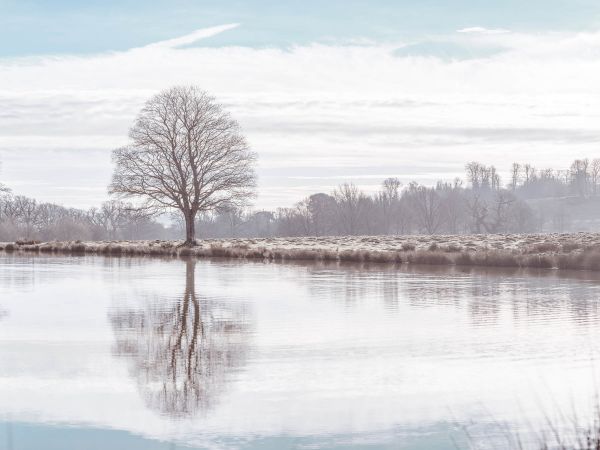 Een meer tijdens de winter in de ochtend. Het gras is nog bevroren en er hangt nog mist over het veld heen.