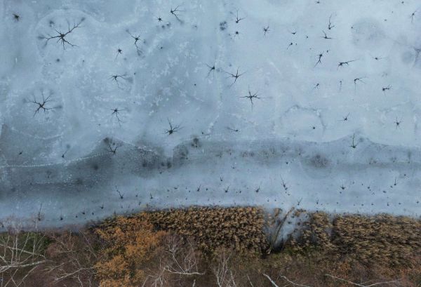 Een intrigerend beeld van een bevroren wateroppervlak, waarin diepzwarte barsten als nerven door het ijs lopen. De organische patronen contrasteren prachtig met de warme tinten van het dorre riet en de bomen langs de waterkant. Een spel van texturen en vormen dat een serene, maar mysterieuze winterse sfeer oproept.