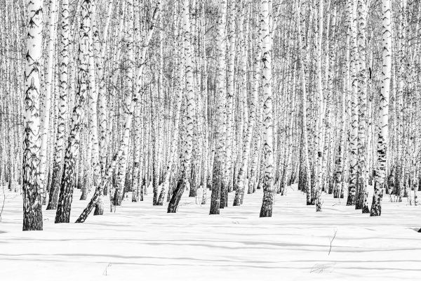 Een zwart-wit foto van een berkenbos winterlandschap.
