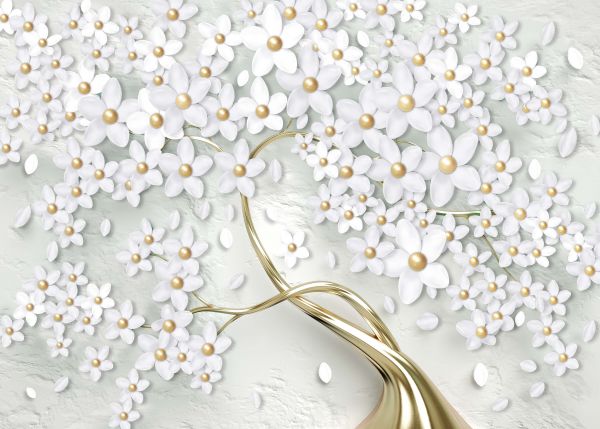 Een geïllustreerde gouden boom met takken vol kleine wit gouden bloemen.