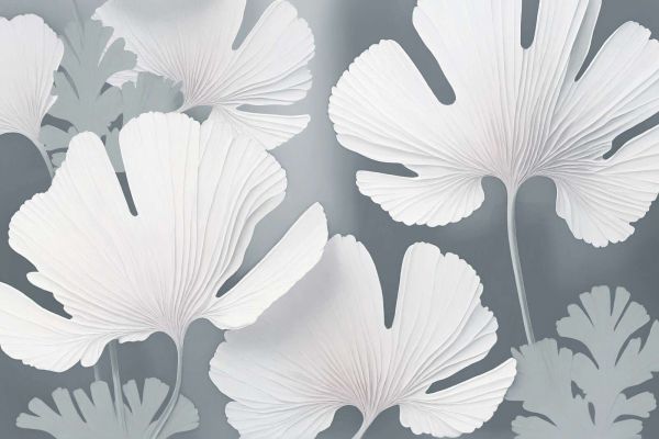 Deze compositie toont elegante ginkgo bladeren in een verfijnd palet van wit, parelgrijs en zacht nevelblauw. De waaiervormige vormen zijn rijk gedetailleerd met fijne, gelijkmatig verlopende nerven die zorgen voor een subtiel reliëfeffect. De achtergrond in koele grijstonen versterkt het lichte karakter van de bladeren en creëert een kalme, harmonieuze sfeer. Het minimalistische kleurenschema zorgt voor een tijdloze uitstraling waarin rust en verfijning centraal staan.