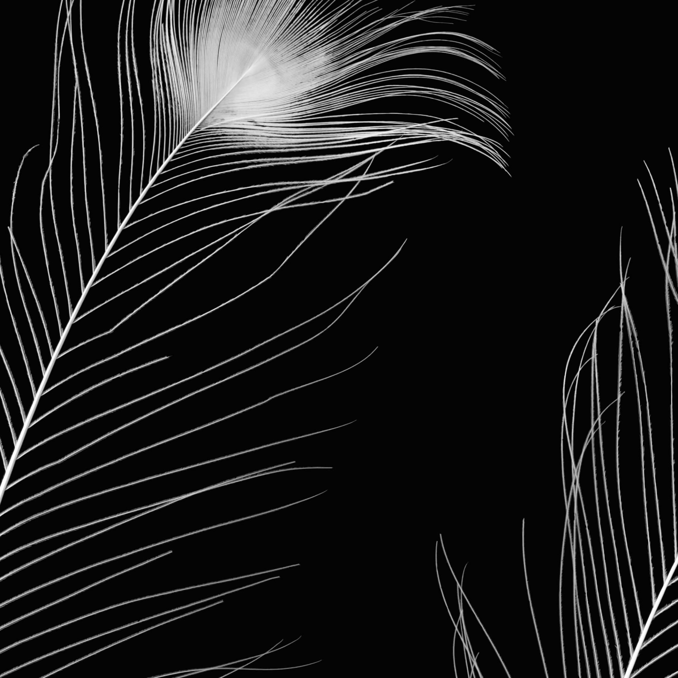 Witte pauwenveren op een donkere achtergrond. Combineer dit in jouw slaapkamer.