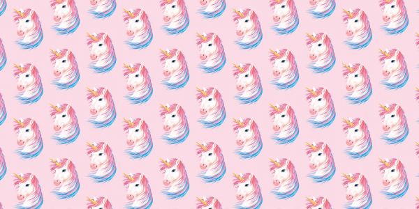 Een patroon van witte unicorns met gouden hoorns op een licht roze achtergrond.