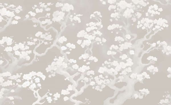 De warme ondertoon van de taupe-achtergrond combineert moeiteloos met neutrale kleuren als crème, zand en leem, maar ook met donkere houtsoorten voor wat extra contrast. Voor wie graag een verfijnde twist toevoegt, zijn zachte pastelaccenten zoals saliegroen of oudroze een mooie optie. Ze benadrukken het bloesemthema en creëren een romantische gloed in de kamer.
