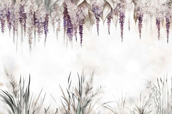 Een elegant en sereen ontwerp waarin blauweregenbloemen subtiel naar beneden hangen, omlijst door zacht wuivend wildgras. De neutrale tinten van beige, grijs en paars in aquarelstijl creëren een rustgevende, natuurlijke sfeer. De delicate overgangen en zachte lichtinval geven dit ontwerp een dromerige en tijdloze uitstraling.