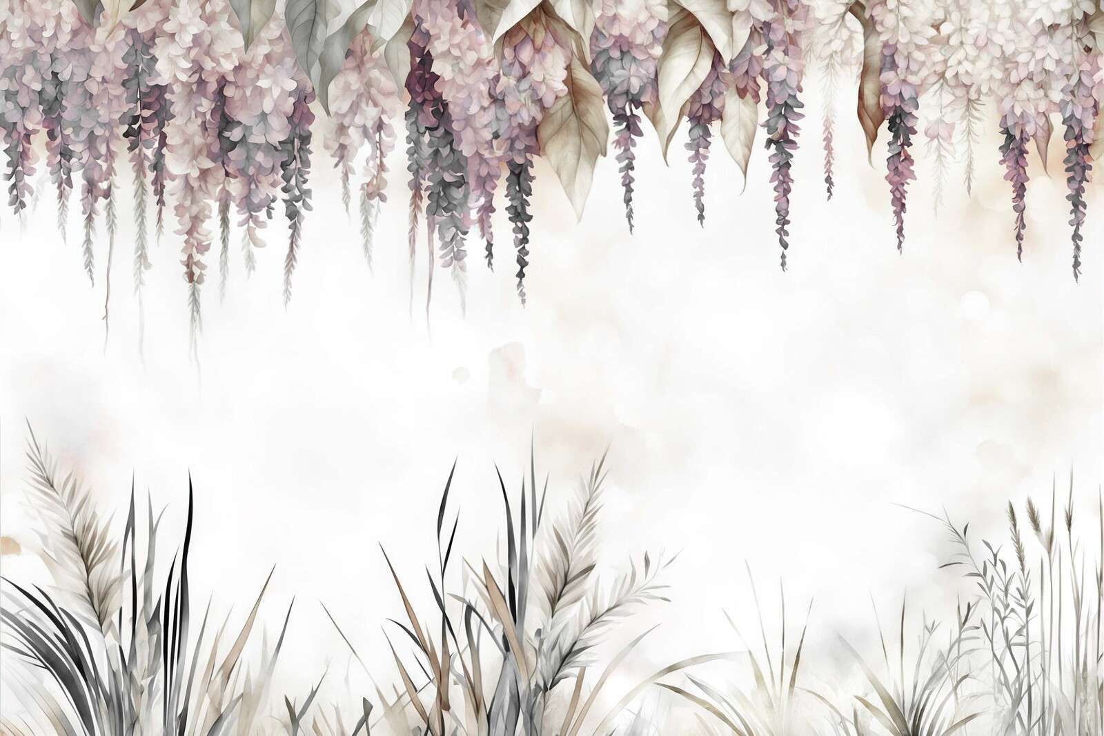 Een verfijnd ontwerp waarin hangende blauweregenbloemen zacht overlopen in een landschap van sierlijk wildgras. De subtiele tinten van lila, sepia en grijs in aquarelstijl creëren een dromerige en rustgevende uitstraling. De delicate kleurverlopen en de zachte lichtinval geven dit ontwerp een elegante, natuurlijke sfeer.