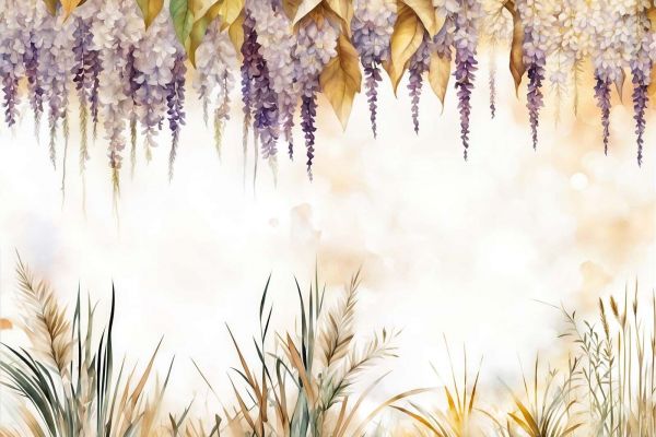 Dit prachtige ontwerp brengt de zachte elegantie van de natuur samen in een harmonie van hangende blauweregenbloemen, goudgele bladeren en sierlijk wuivend wildgras. De aquareltechniek creëert een dromerig effect, waarbij de lavendelkleurige bloemtrossen subtiel overlopen in warme zand- en goudtinten. De speelse lichtinval en zachte kleurverlopen geven het geheel een luchtige, rustgevende uitstraling.