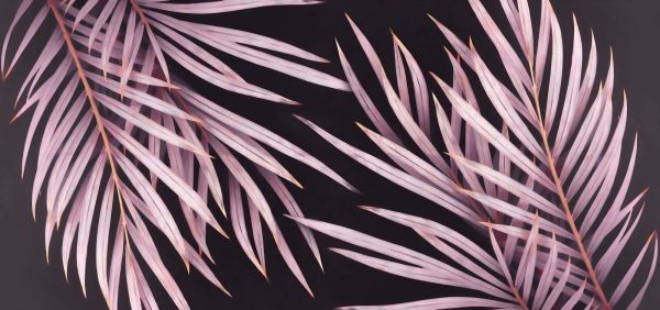 Sierlijke palmbladeren in oudroze en poederachtige tinten steken elegant af tegen een diepe donkere achtergrond. De slanke vormen, lichte transparantie en warme accenten geven het beeld een luxe, rustige uitstraling met een subtiel botanisch karakter.