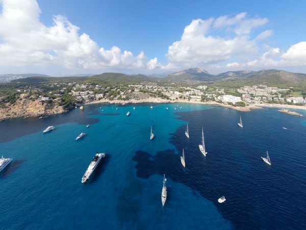 Een prachtige foto van een kust met boten, gefotografeerd van bovenaf.