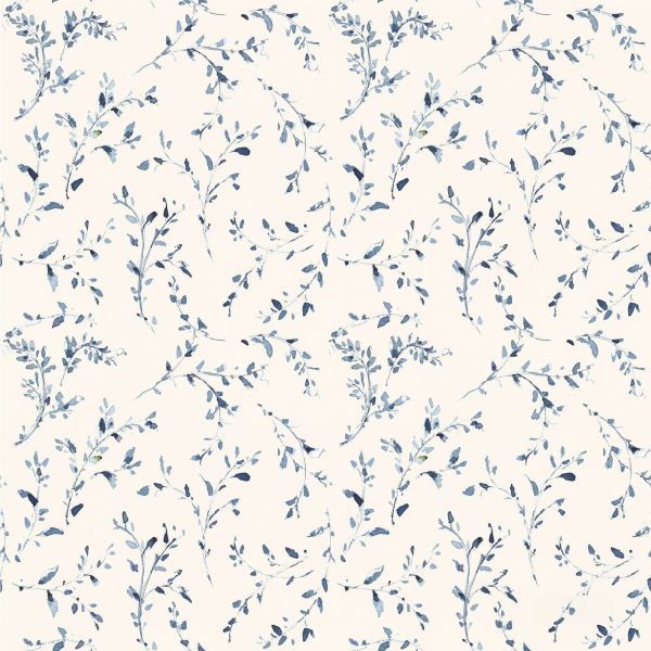 Dit delicate patroon bestaat uit sierlijk gebogen takjes met kleine blaadjes, uitgevoerd in verschillende tinten blauw, variërend van zacht pastelblauw tot diep indigo. De aquareltechniek geeft het geheel een licht transparant en handgeschilderd effect, waardoor het ontwerp levendig blijft ondanks de eenvoud. De takjes vormen een vloeiende herhaling, wat zorgt voor ritme en rust, zonder te overheersen. De warme, lichte achtergrond versterkt het frisse karakter van het blauw en laat de vormen subtiel spreken.