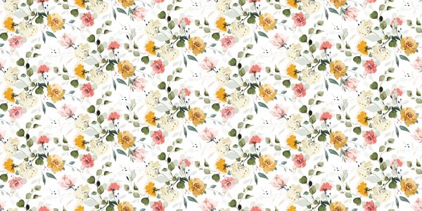 Een poëtisch tafereel van veldbloemen in zomerse tinten strekt zich uit over dit ontwerp, waarbij de bloesems zachtjes overgaan van lichte kleuren naar diep geel en vervaagd roze.