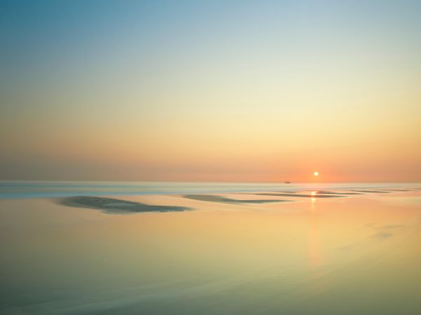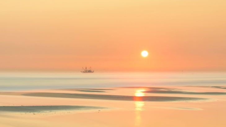 Mooie wadden landschap met een oranje gekleurde zonsondergang en een schip aan de horizon.