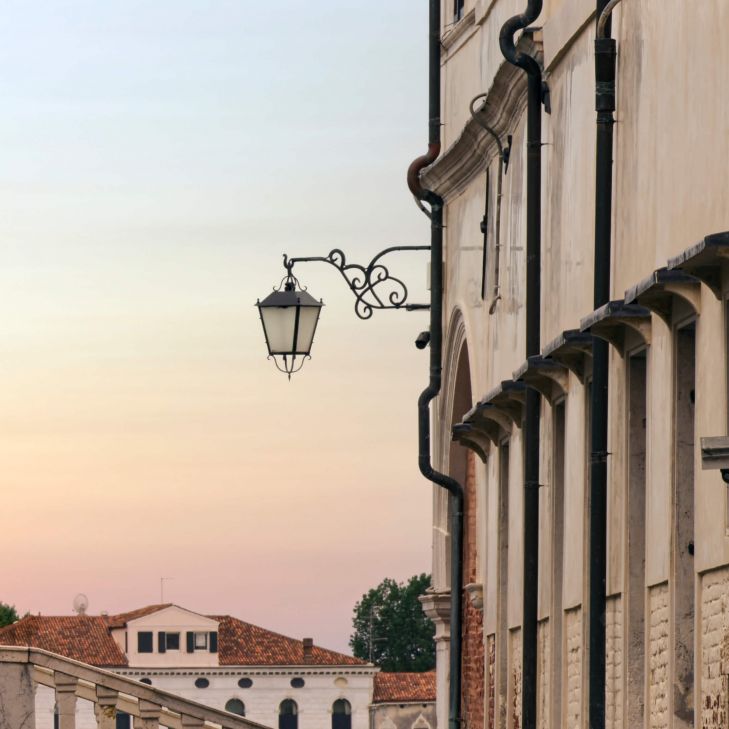 Een mooie zonsondergang in Venetië met links een oude railing die je naar het bruggetje leidt.