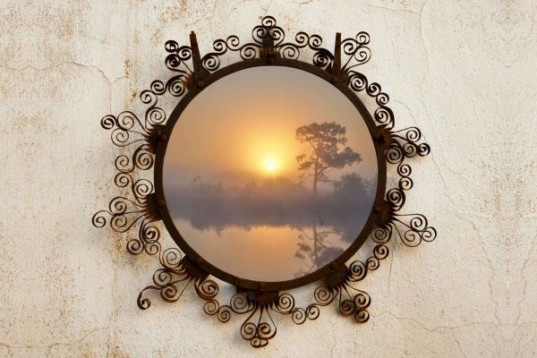 Dit dromerige ontwerp vangt een moment van volledige rust: de zon die opkomt boven een mistig meer, waarbij het zachte licht zich vermengt met de stille nevel die boven het water hangt. Een solitaire boom aan de oever vormt een prachtig silhouet in het gouden ochtendlicht, met een spiegeling die de kalmte van het water benadrukt. De ronde omlijsting met zijn ijzeren, sierlijke krullen voegt een bijna magisch en klassiek gevoel toe aan het tafereel, alsof je door een oude poort naar een andere wereld kijkt.
