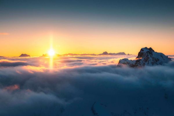 Dit betoverende beeld toont een zeldzaam en adembenemend natuurverschijnsel: een zonsopkomst hoog boven de wolken. De zon breekt net door achter de horizon, en haar gouden stralen overspoelen de wolkenzee met warme tinten. Onder de mist steken enkele besneeuwde bergtoppen krachtig uit, als stille wachters boven een slapende wereld. De kleuren lopen naadloos over van diepblauw naar goudgeel en zachtroze, wat het geheel een dromerig, bijna hemels karakter geeft.
