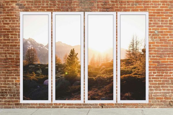 De afbeelding is verdeeld over vier hoge panelen, wat zorgt voor ritme en een indrukwekkende verticale uitstraling. Hierdoor past dit ontwerp perfect in moderne, industriële of rustieke interieurs. In een industriële ruimte – denk aan bakstenen muren, staal en beton – voegt dit ontwerp warmte en natuurlijk contrast toe. In een chalet- of landelijke stijl komt de verbinding met het buitenleven nog sterker naar voren.