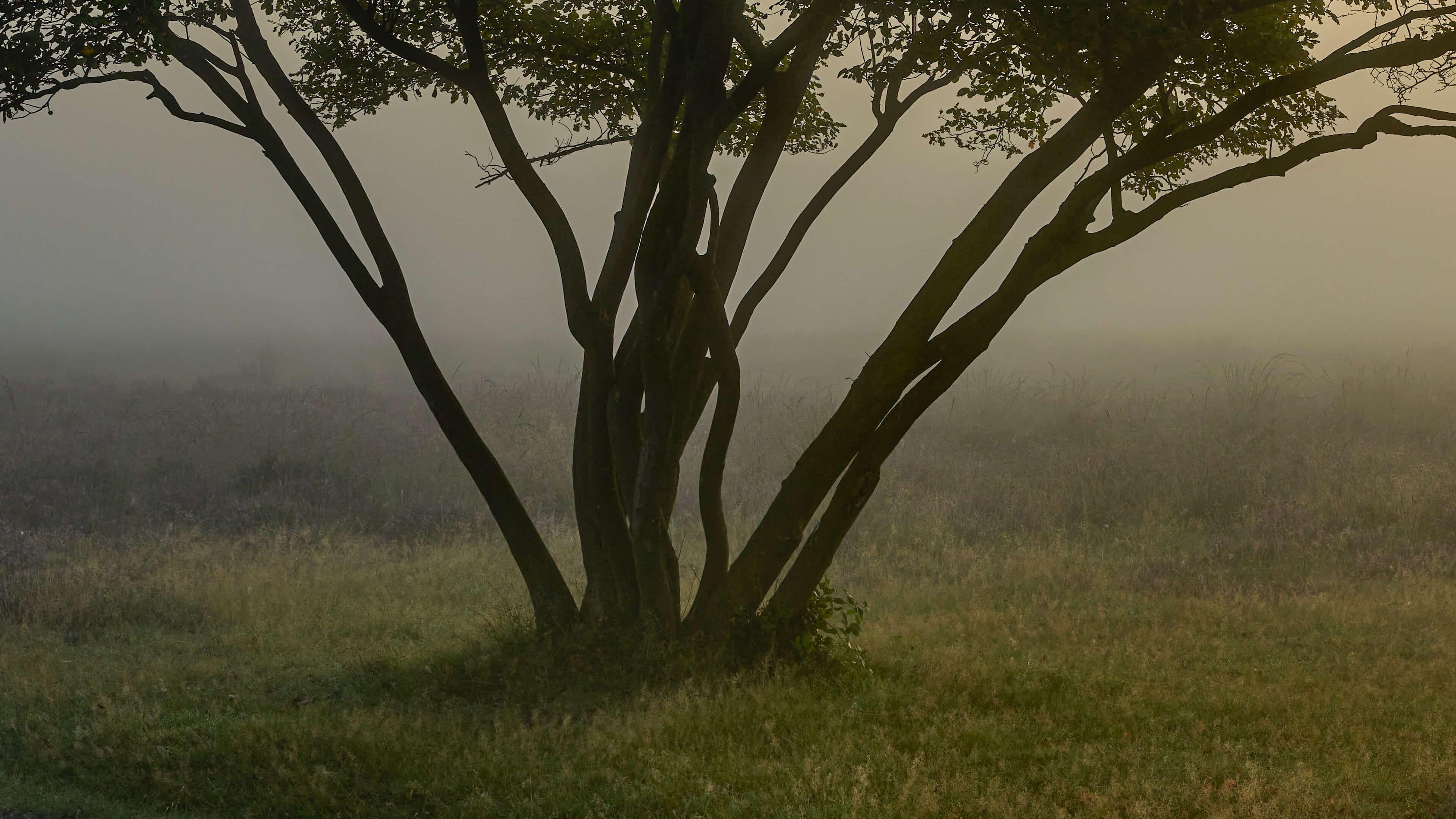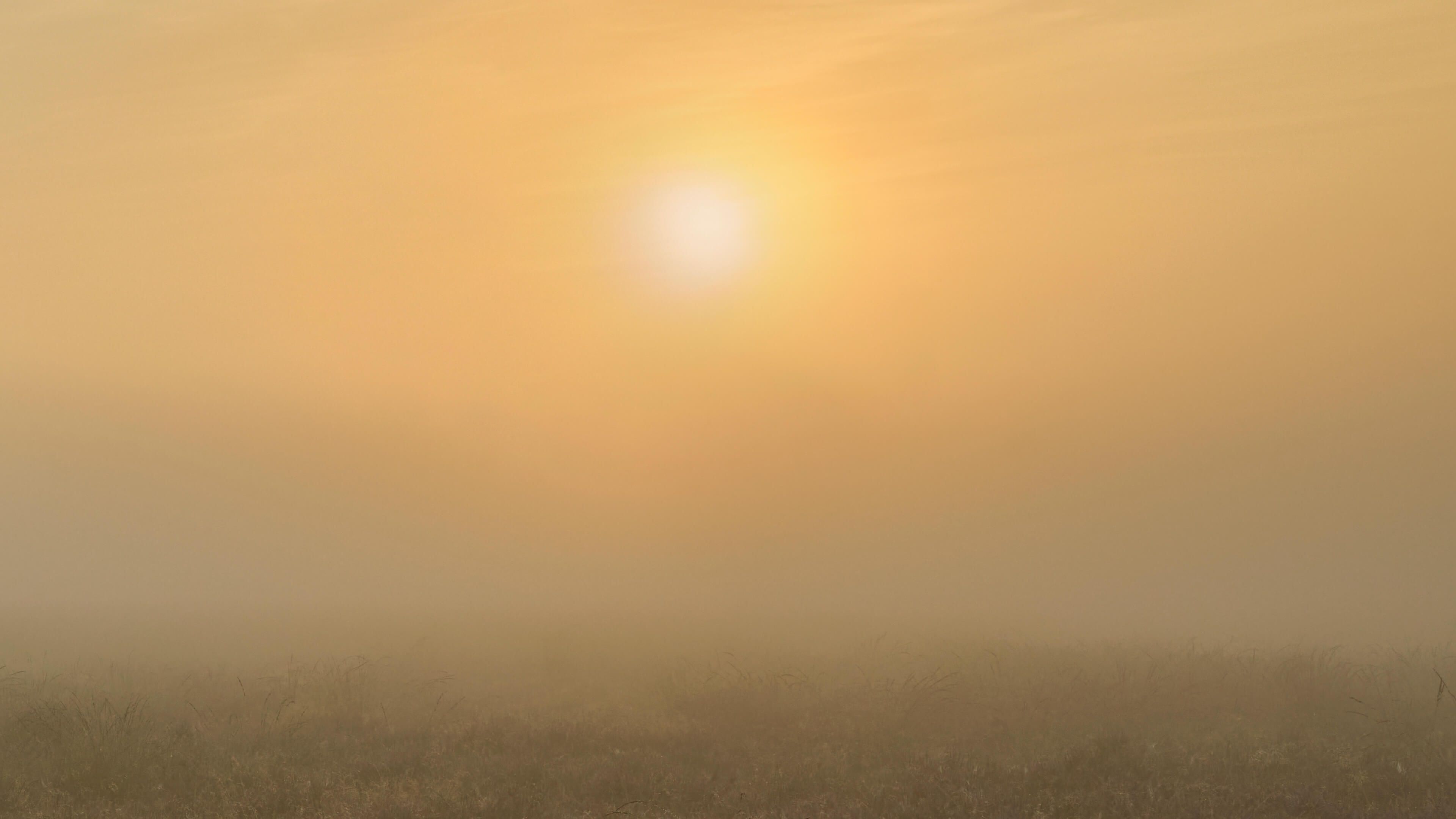 Mistige zonsopkomst op de heide. Combineer dit fotobehang in jouw woning voor nog meer sfeer.