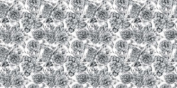 Dit design vangt de essentie van een monochrome tuin, met een scala aan bloemen en bladeren in grijstinten. De grootse rozen en subtiele hortensia’s zijn weergegeven in fijne, gedetailleerde schetsen, waardoor een klassieke en tijdloze elegantie wordt gecreëerd.
