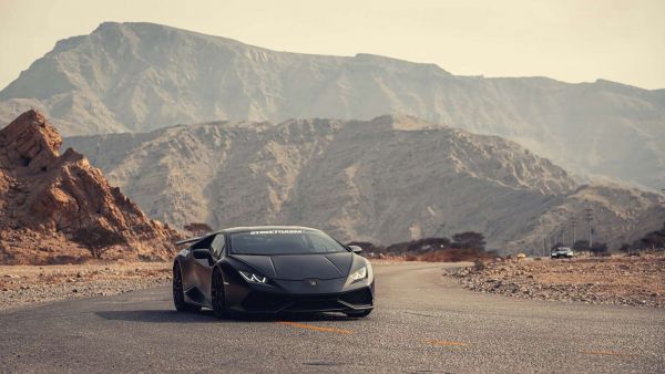Een krachtige zwarte supercar domineert een verlaten woestijnweg, omringd door ruige rotsen en imposante bergen. De diepe, matte lak en scherpe lijnen van de auto contrasteren perfect met het stoffige, warme landschap, wat een gevoel van snelheid en exclusiviteit oproept.
